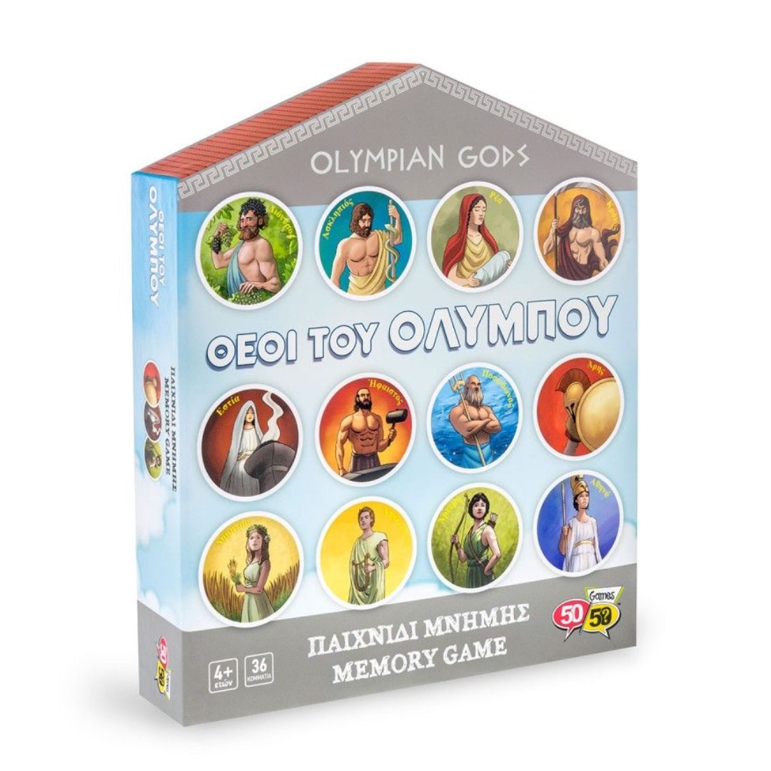 Παιχνίδι μνήμης και παρατηρητικότητας εμπνευσμένο από την Ελληνική Μυθολογία. Τοποθέτησε τις στρογγυλές κάρτες που αναπαριστούν τους Ολύμπιους θεούς ανάποδα και προσπάθησε να βρεις και να ταιριάξεις τα όμοια ζευγάρια. Σχεδιασμένο από Έλληνες εικονογράφους και εκπαιδευτικούς με έναν πολύ διασκεδαστικό τρόπο, τα παιδιά καλλιεργούν την απεικονιστική μνήμη, τη συγκέντρωση και τις γνωστικές ικανότητές τους. Διαστάσεις: 15 x 18 x 5,5 εκ.