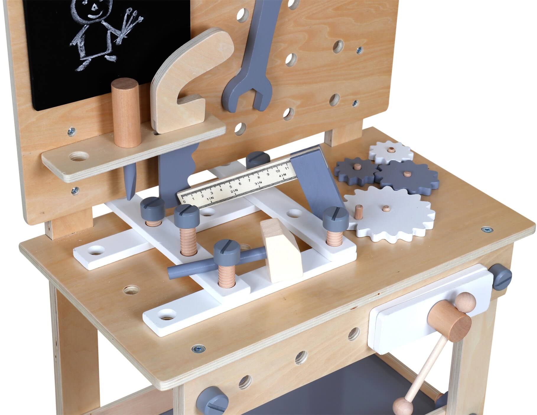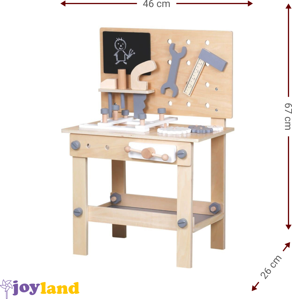 Ο παιδικός πάγκος εργασίας Joyland Dock θα προσφέρει ατελείωτες ώρες παιχνιδιού στο παιδί σας, ενώ βοηθά στην εξασκήσει των δεξιοτήτων του, την λογική σκέψη και την δημιουργικότητα. Διαθέτει μαυροπίνακα κιμωλίας, μεγάλο ράφι στο κάτω μέρος, κατσαβίδι με βίδες, γρανάζια, πριόνι, σφυρί, γερμανικό κλειδί, γωνιόμετρο και μέγγενη, όλα τα απαραίτητα εργαλεία για κάθε νέο τεχνίτη! – Διαθέτει ράφι και διάφορες θήκες για τα εργαλεία – Υψηλή ποιότητας κατασκευής