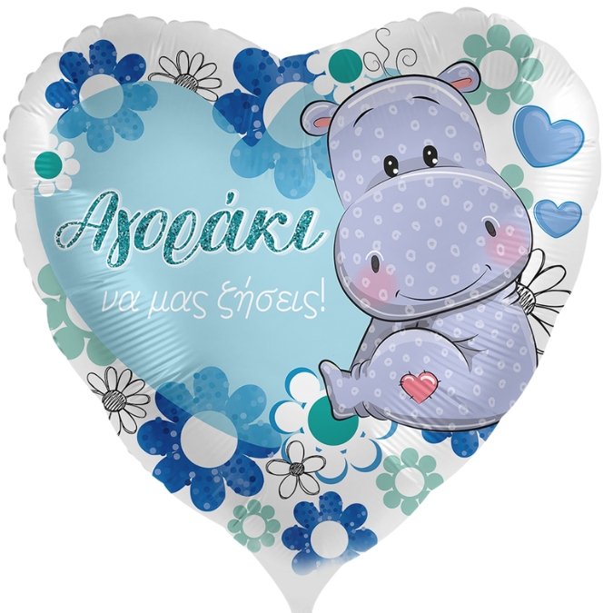 Μπαλόνι καρδιά με σχέδιο γλυκό Ιποπόταμο και μήνυμα “Αγοράκι να μας ζήσεις”. Χαρίστε στο μωράκι σας την καλύτερη υποδοχή!