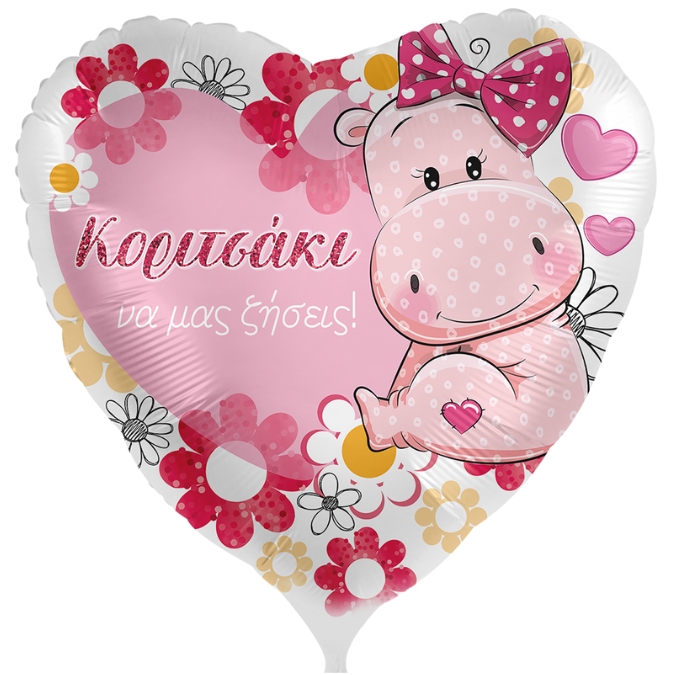 Μπαλόνι καρδιά με σχέδιο γλυκό Ιποπόταμο και μήνυμα “Κοριτσάκι να μας ζήσεις”. Χαρίστε στο μωράκι σας την καλύτερη υποδοχή!