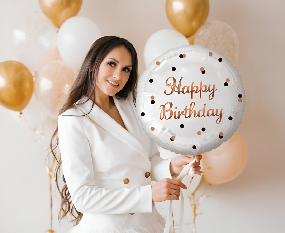 Εντυπωσιακό στρογγυλό λευκό μπαλόνι γενεθλίων με ροζ-χρυσά γράμματα! Μια όμορφη ιδέα για διακόσμηση πάρτυ ή για δώρο στον εορτάζοντα!