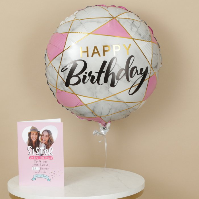 Εντυπωσιακό, foil μπαλόνι γενεθλίων με μήνυμα Happy Birthday και σχέδιο μάρμαρο σε χρώματα χρυσό και ροζ.