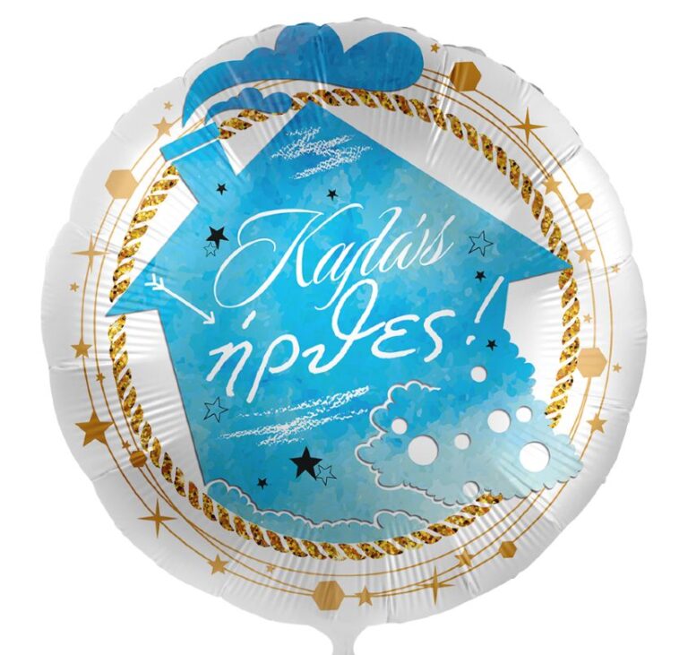 Μπαλόνι με μήνυμα “”Καλώς ήρθες”” και φόντο γαλάζιο σπίτι. Ιδανικό για να το χαρίσεις ως δώρο για τον ερχομό του μωρού ή για να στολίσεις το σπίτι για την υποδοχή ενός αγαπημένου προσώπου!